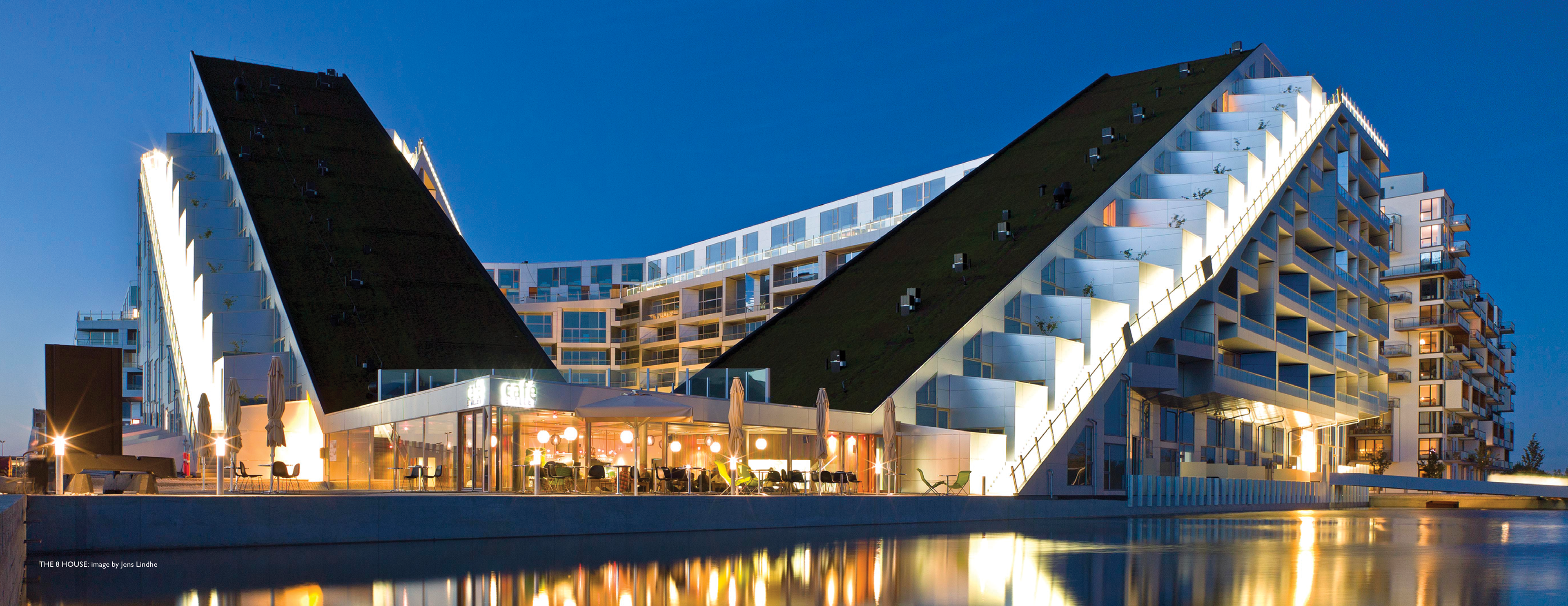 Full-image spread featuring the 8 House residential complex in Copenhagen, using large-scale architectural photography to emphasize the project’s terraced form, illuminated circulation paths, and sculptural relationship to the surrounding waterfront.
