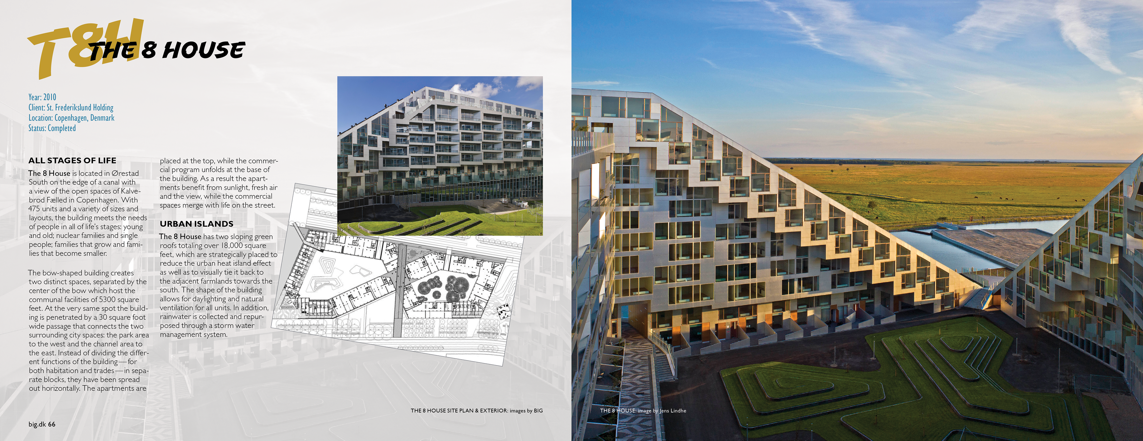 Editorial spread presenting the 8 House residential complex in Copenhagen. The layout juxtaposes exterior photography with site plans and explanatory text to describe the project’s mixed-use program and terraced architectural structure.