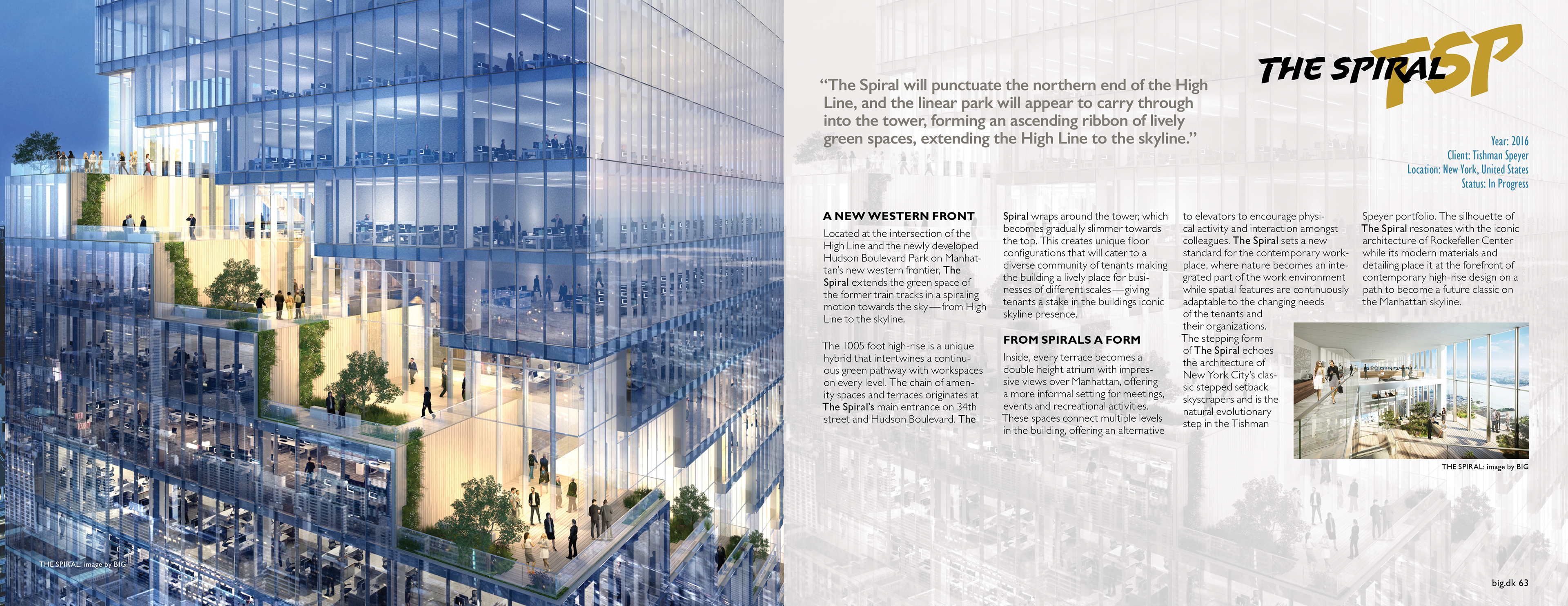 Project spread highlighting the proposed Spiral tower development in New York. Large-scale architectural imagery is paired with explanatory text and supporting visual material to communicate the building’s form, circulation concept, and urban integration.