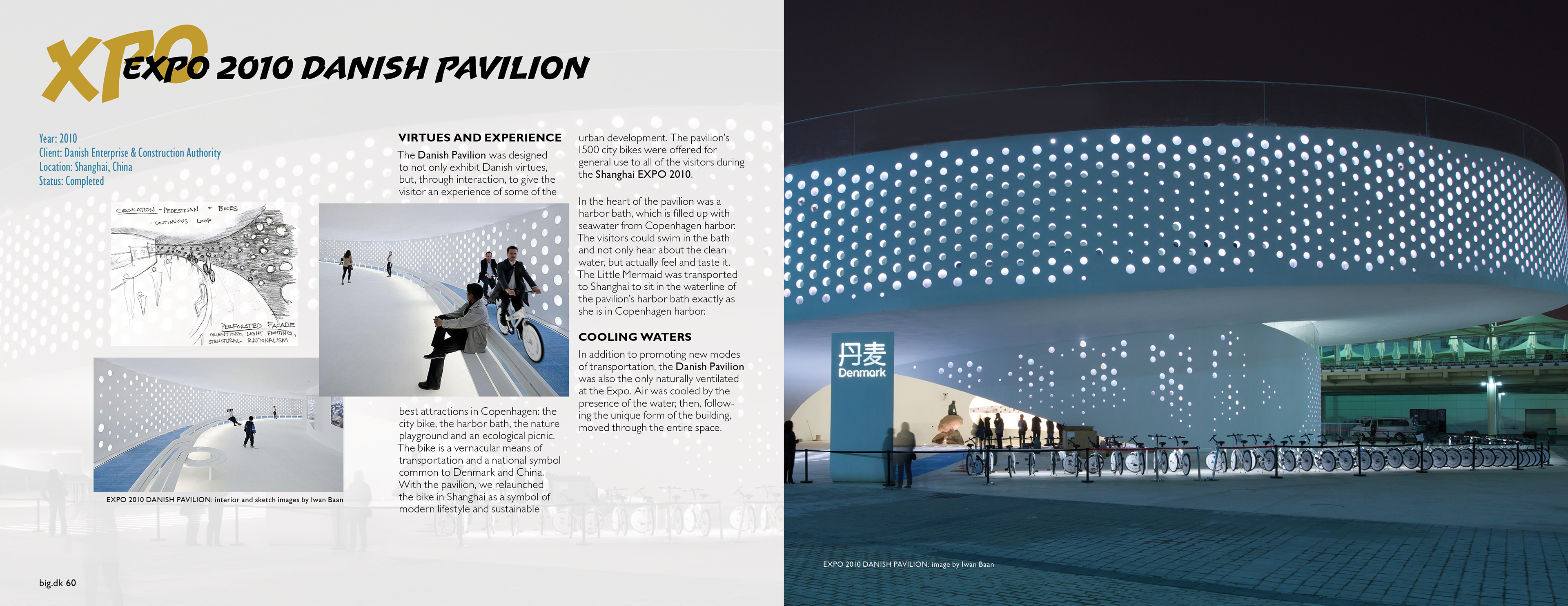 Editorial spread documenting the Danish Pavilion designed for the 2010 World Expo in Shanghai. The layout integrates architectural photography, conceptual sketches, and descriptive text to explain the pavilion’s experiential and environmental design strategies.