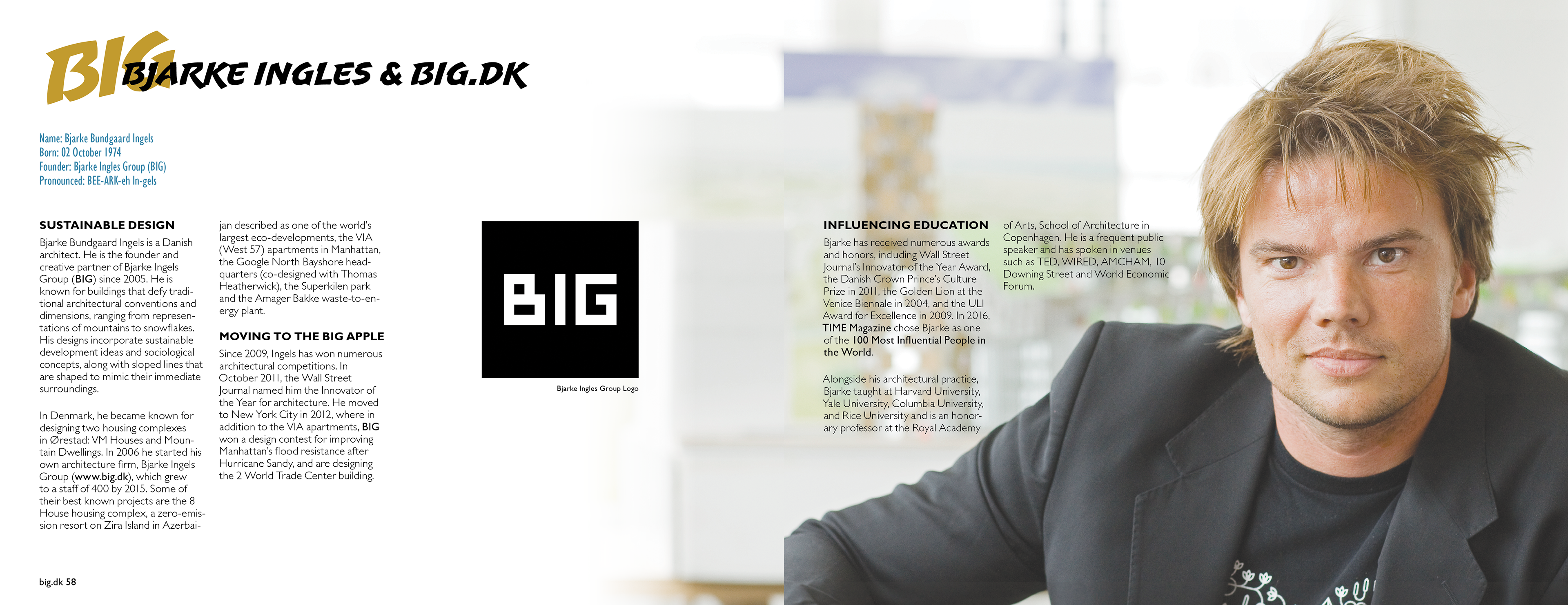 Introductory spread presenting biographical information about architect Bjarke Ingels alongside the identity of Bjarke Ingels Group (BIG). The layout combines portrait photography, studio branding, and structured text blocks to establish context for the projects featured in the publication.