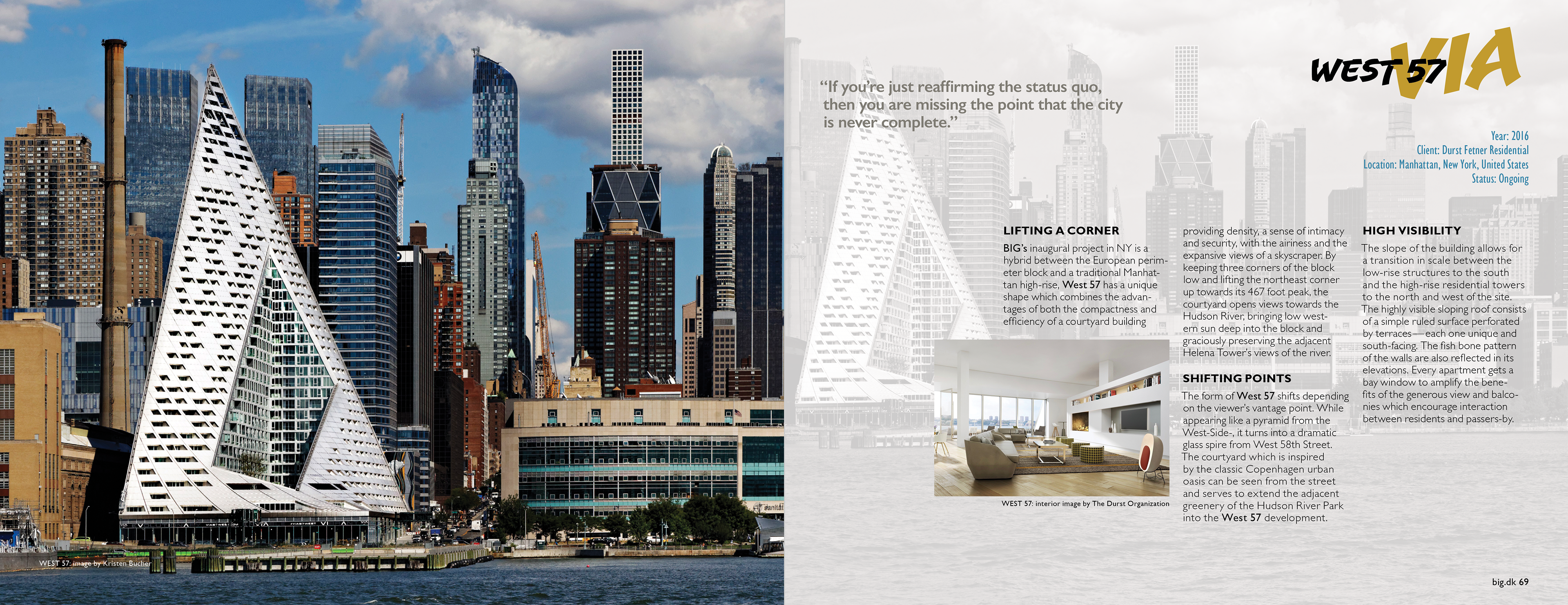 Project spread featuring the West 57th residential building in Manhattan. The layout uses large architectural imagery and structured text to explain the building’s distinctive form and relationship to the surrounding urban environment.