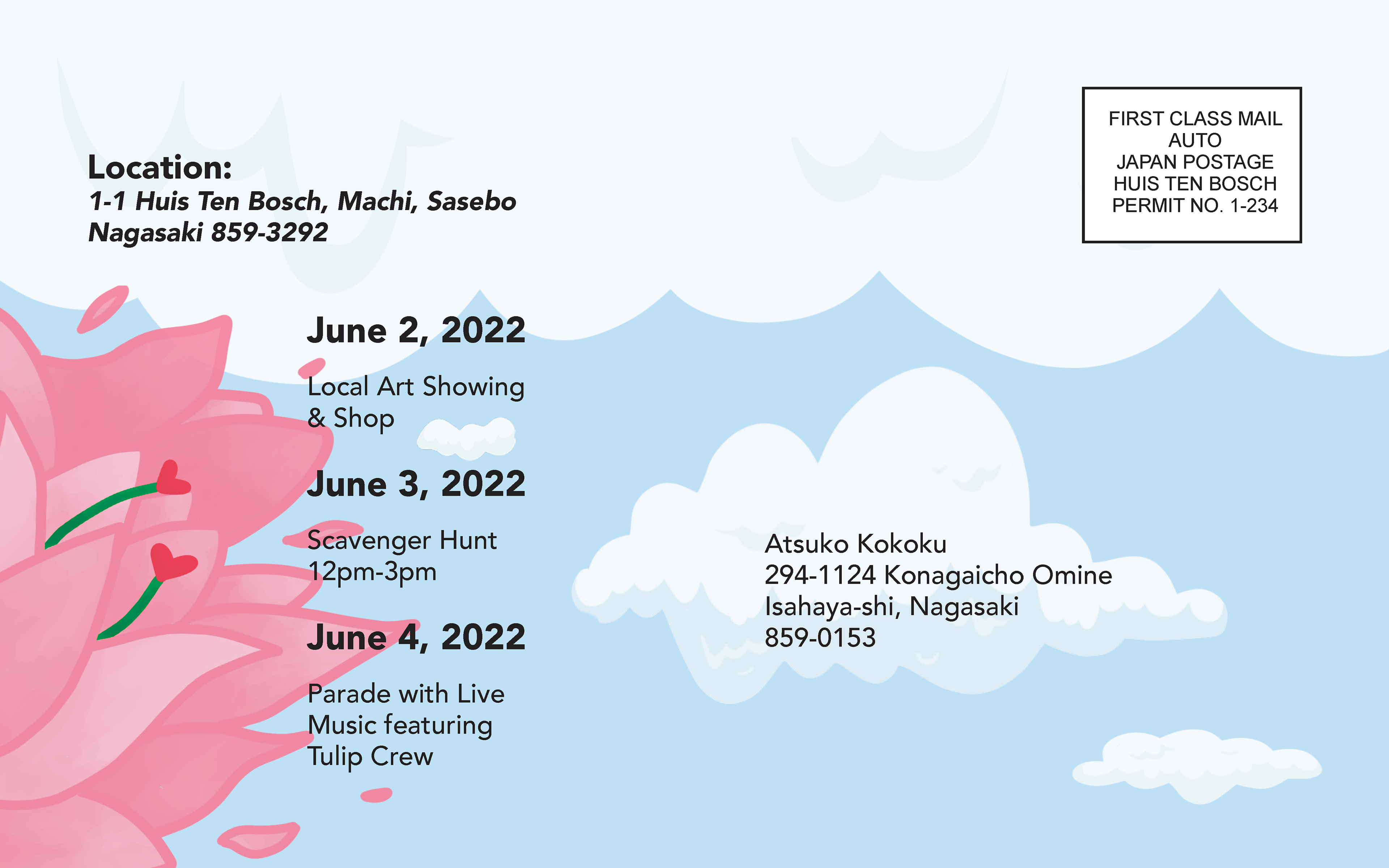Postcard back (event details/mail panel): Postcard back organized with a clear information hierarchy—date-driven schedule, location block, and postal indicia—balanced against large-scale illustration and open negative space.