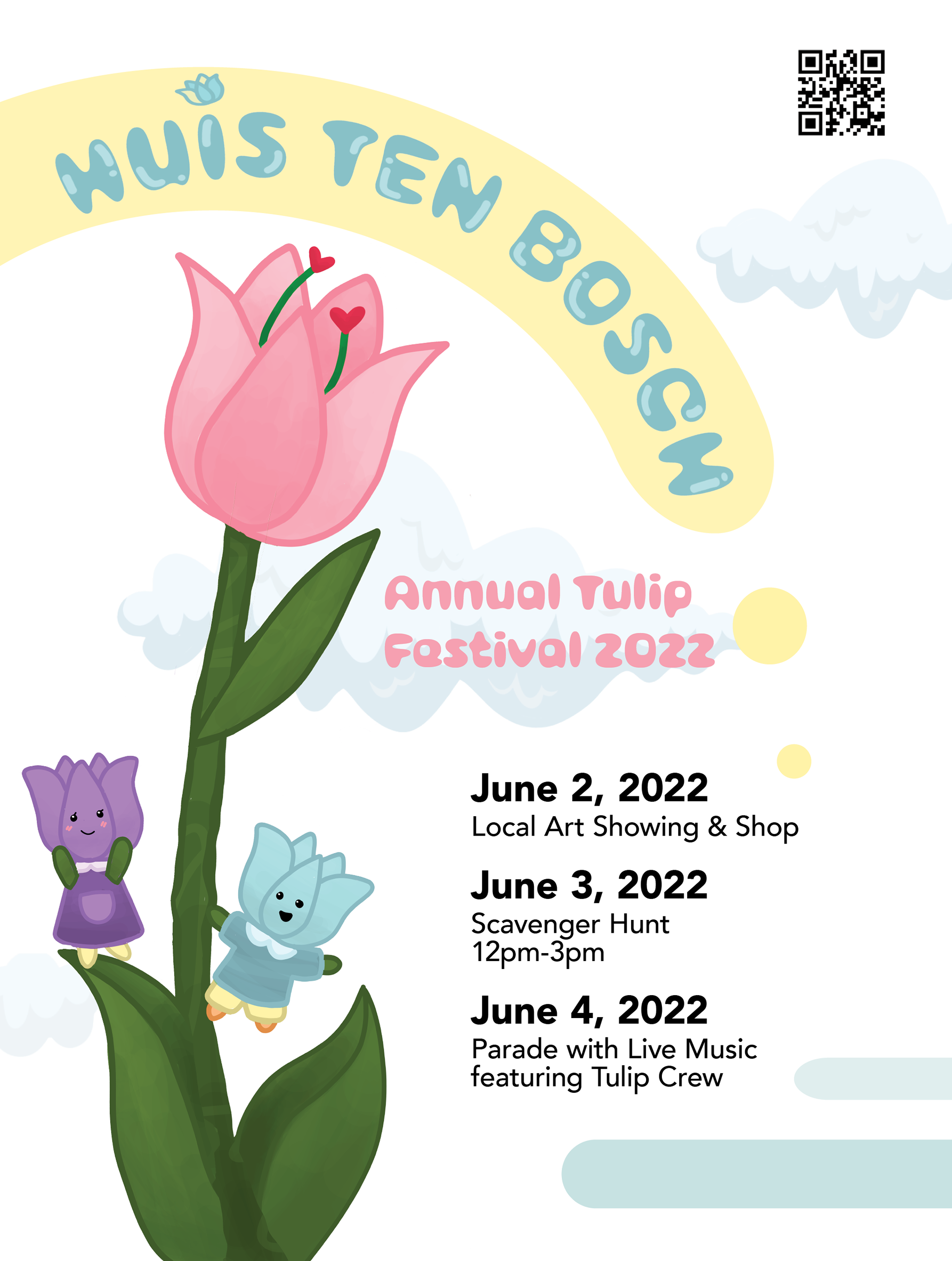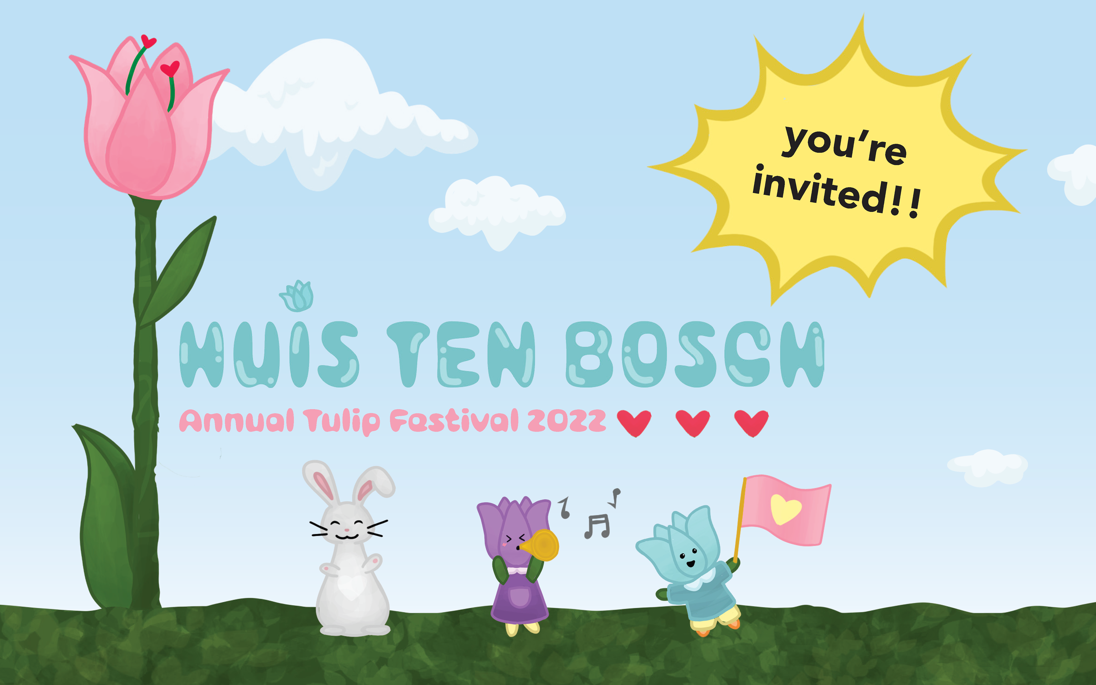 Postcard front (invitation): Illustrated postcard front establishing a playful event identity through soft color palette, character-based imagery, and expressive display typography to create an inviting tone.