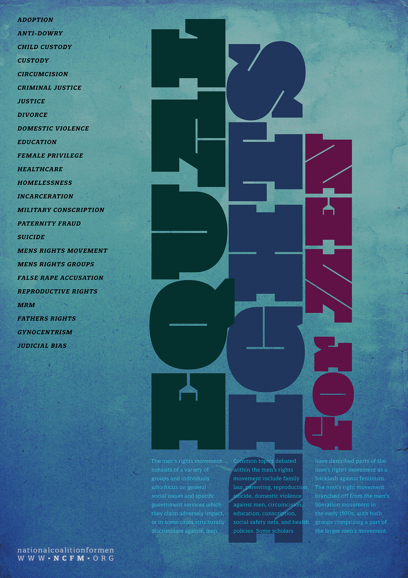 The concept centers on “Equal Rights for Men,” translating the tension and urgency of the topic into oversized, compressed letterforms that function as both message and image.