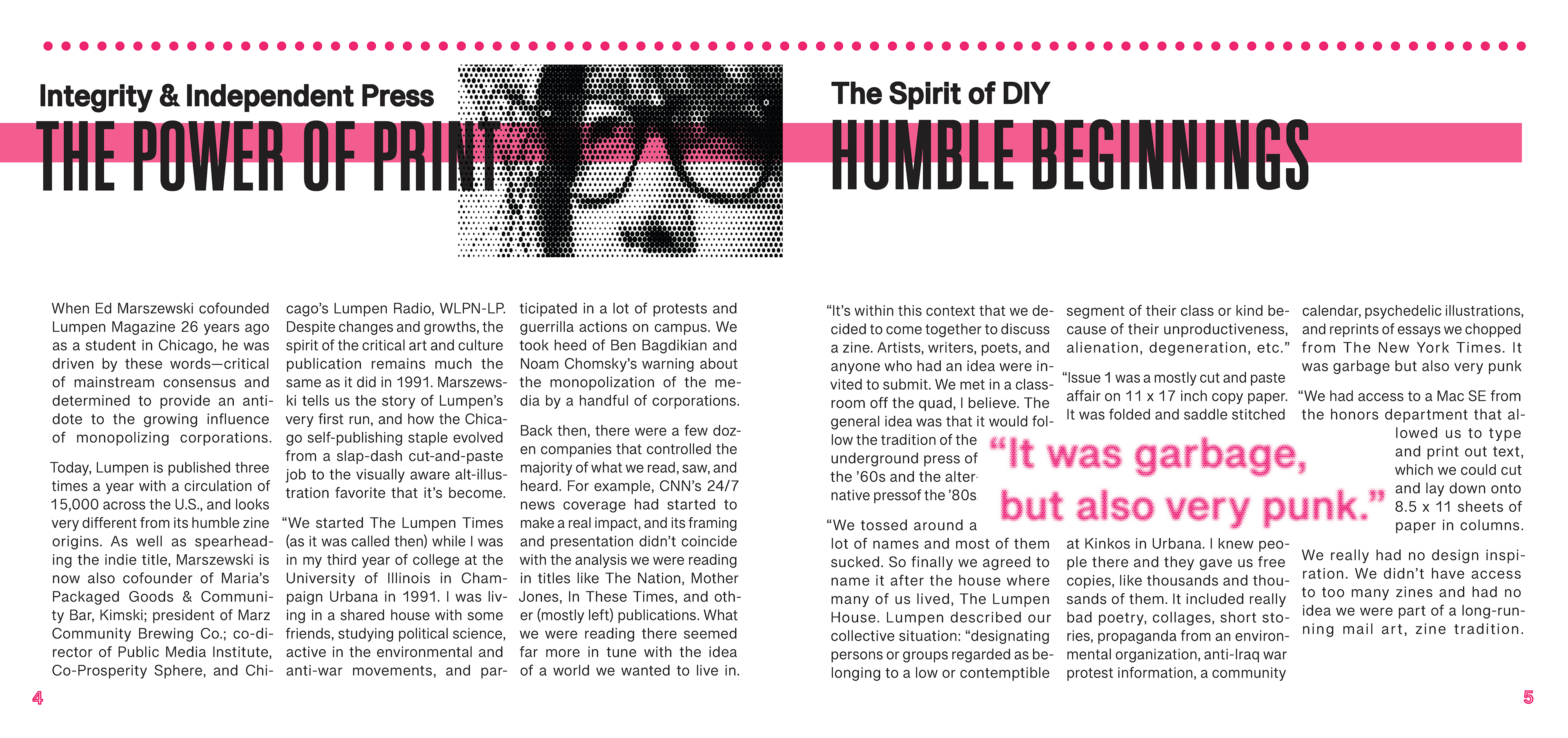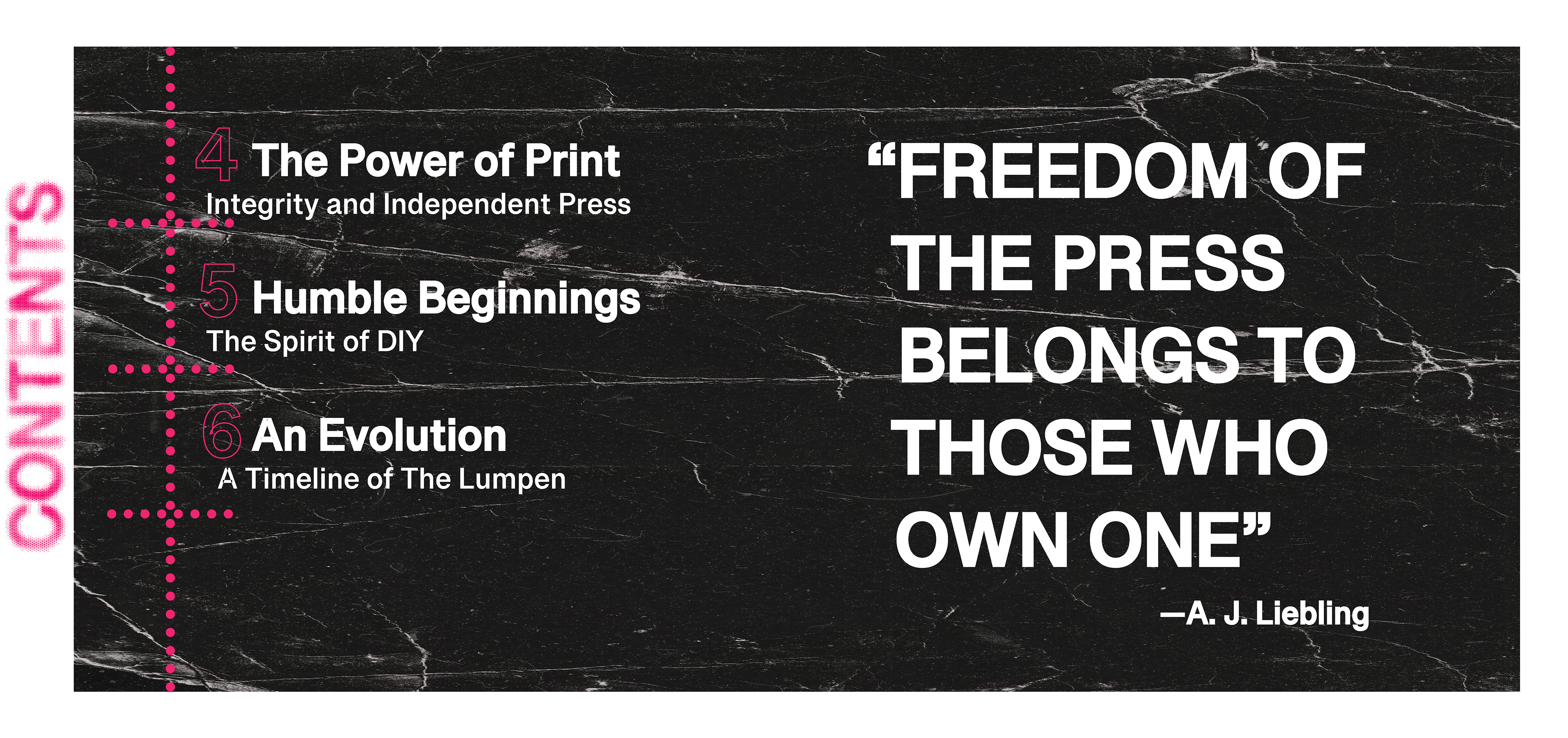 Spread 1: A high-contrast contents layout pairs a large pull-quote with a textured black image plate, using magenta dot leaders and rules to organize navigation and hierarchy.