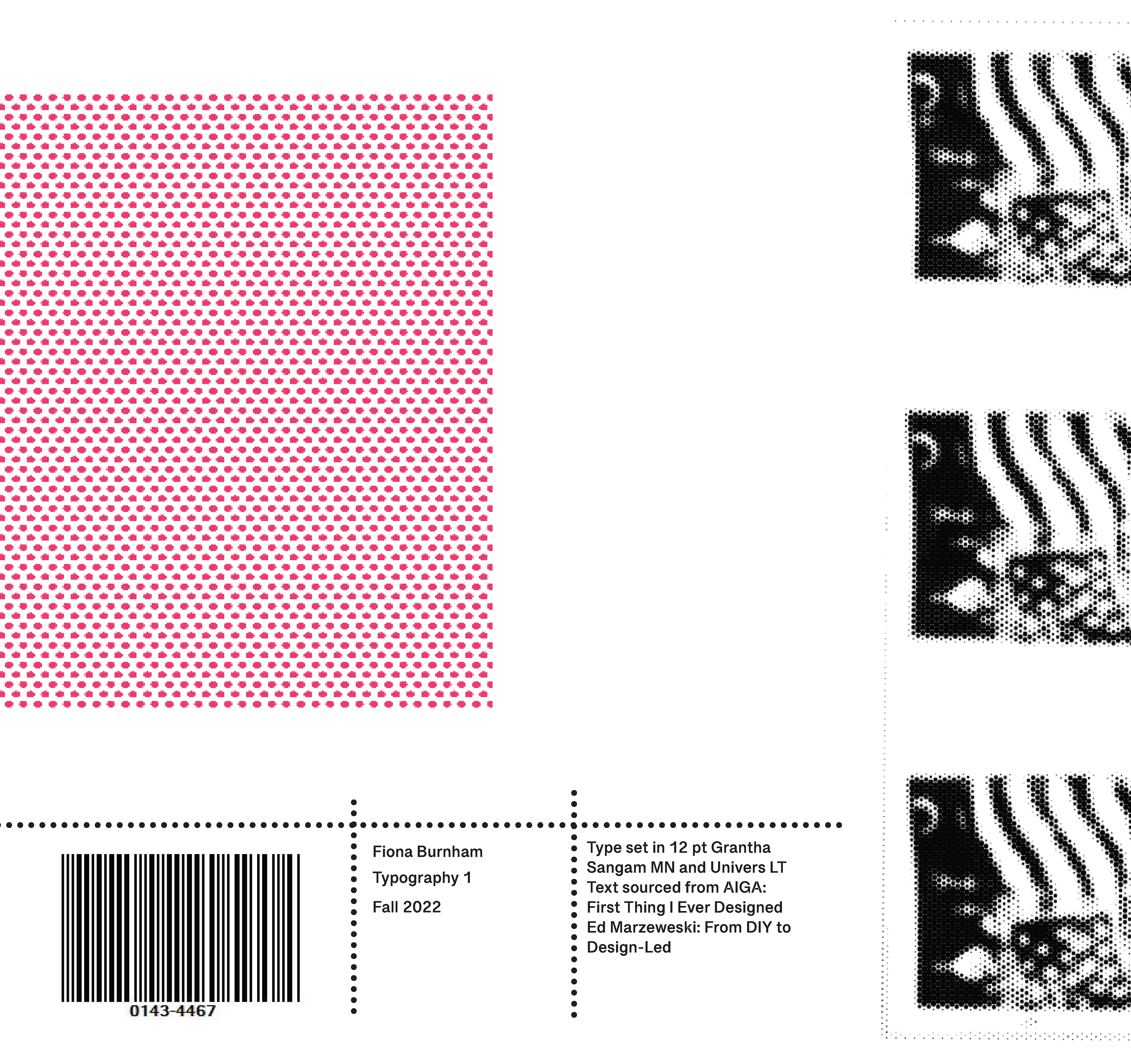 This assignment introduced sequential typographic design through the creation of an eight-page booklet based on a design-related topic sourced from the AIGA website. Students developed a narrative structure in which typography, imagery, and written content work together to communicate a focused aspect of the chosen subject over time, rather than in a single-view composition.
