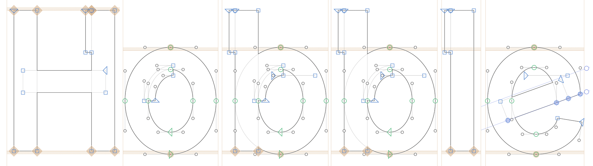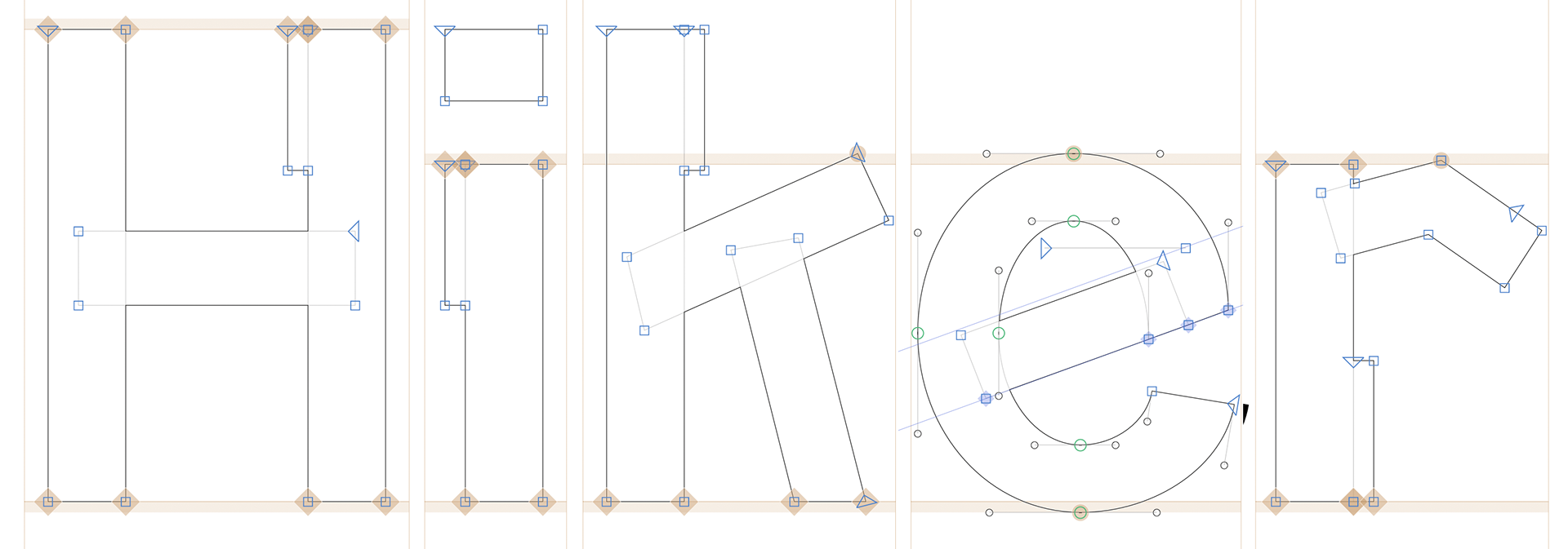 Vector construction outline for Hiker, showing anchor points, Bézier handles, and alignment logic used to establish proportions, stroke relationships, and counter structure.