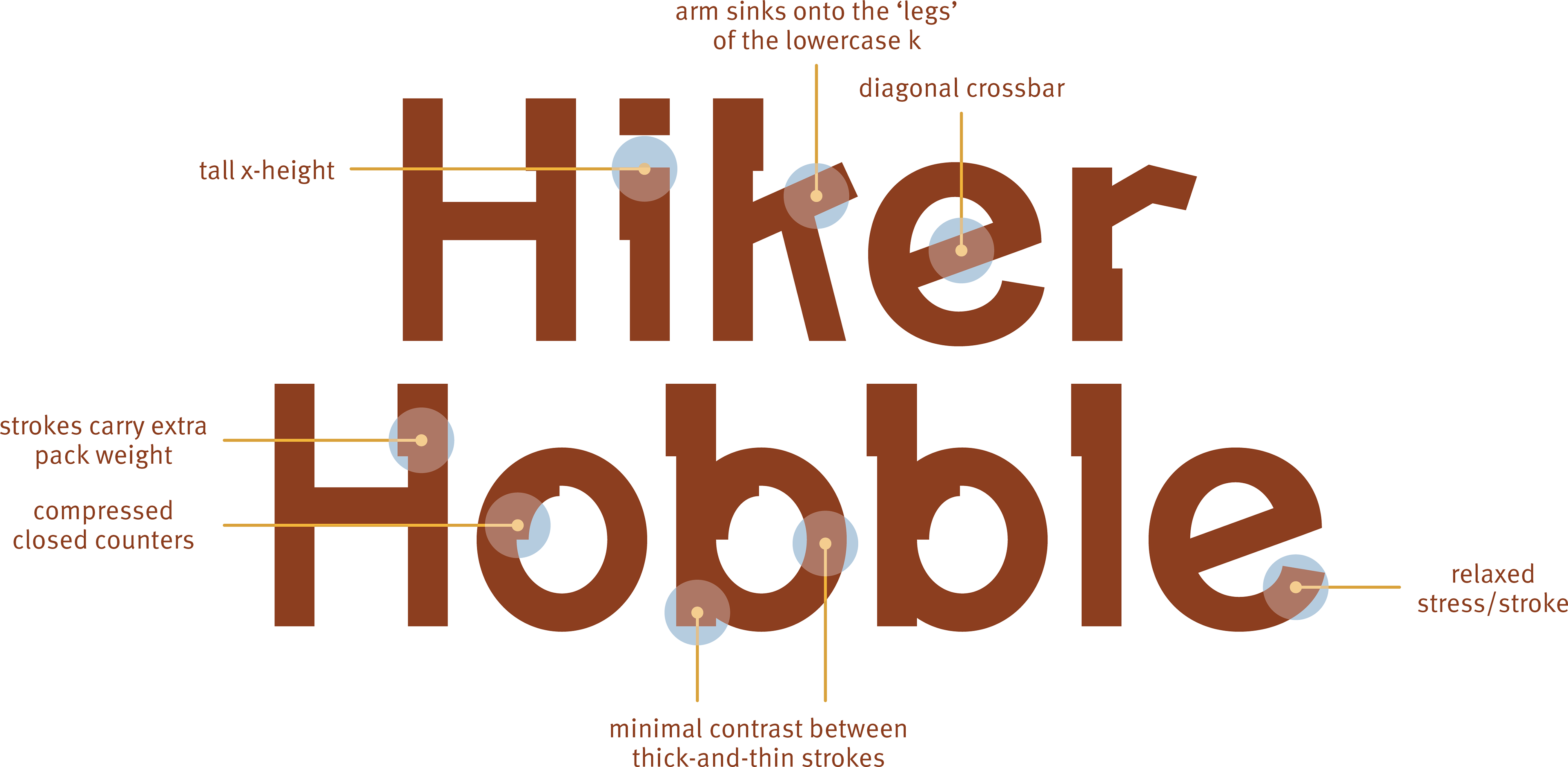 Annotated analysis of key formal attributes—including tall x-height, compressed counters, minimal stroke contrast, and diagonal relationships—used to define the mark’s rugged, stable character.