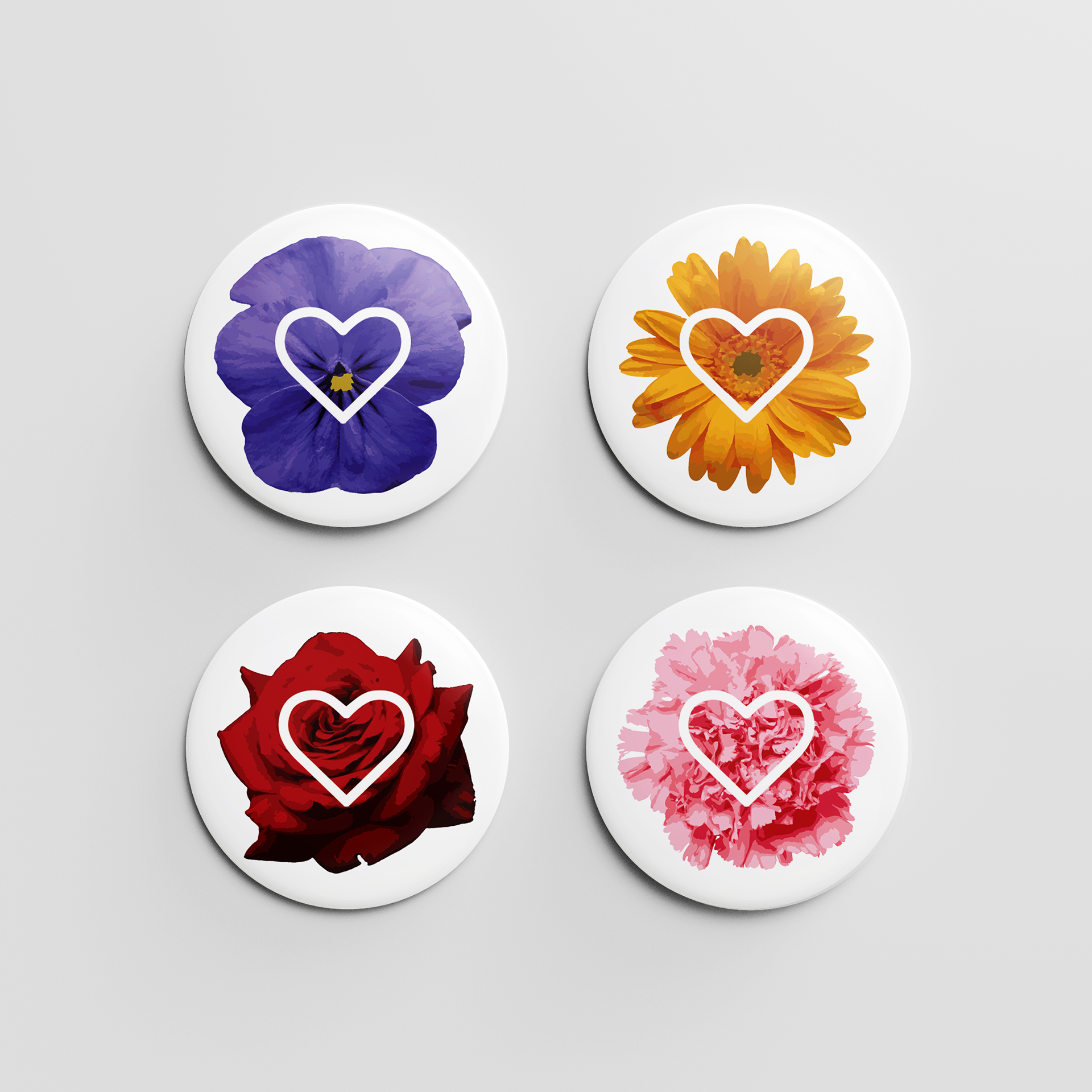 The series demonstrates a design approach grounded in variation within a consistent system. Each button maintains a shared structural format, including a circular field, centered floral imagery, and an overlaid heart motif, while shifting color and flower type to create distinction across the set. This consistency supports recognition and cohesion, while the variations introduce visual rhythm and collectability. The mockups also show attention to presentation, using clean product visualization and restrained backgrounds to emphasize form, color contrast, and the relationship between surface graphic and object.