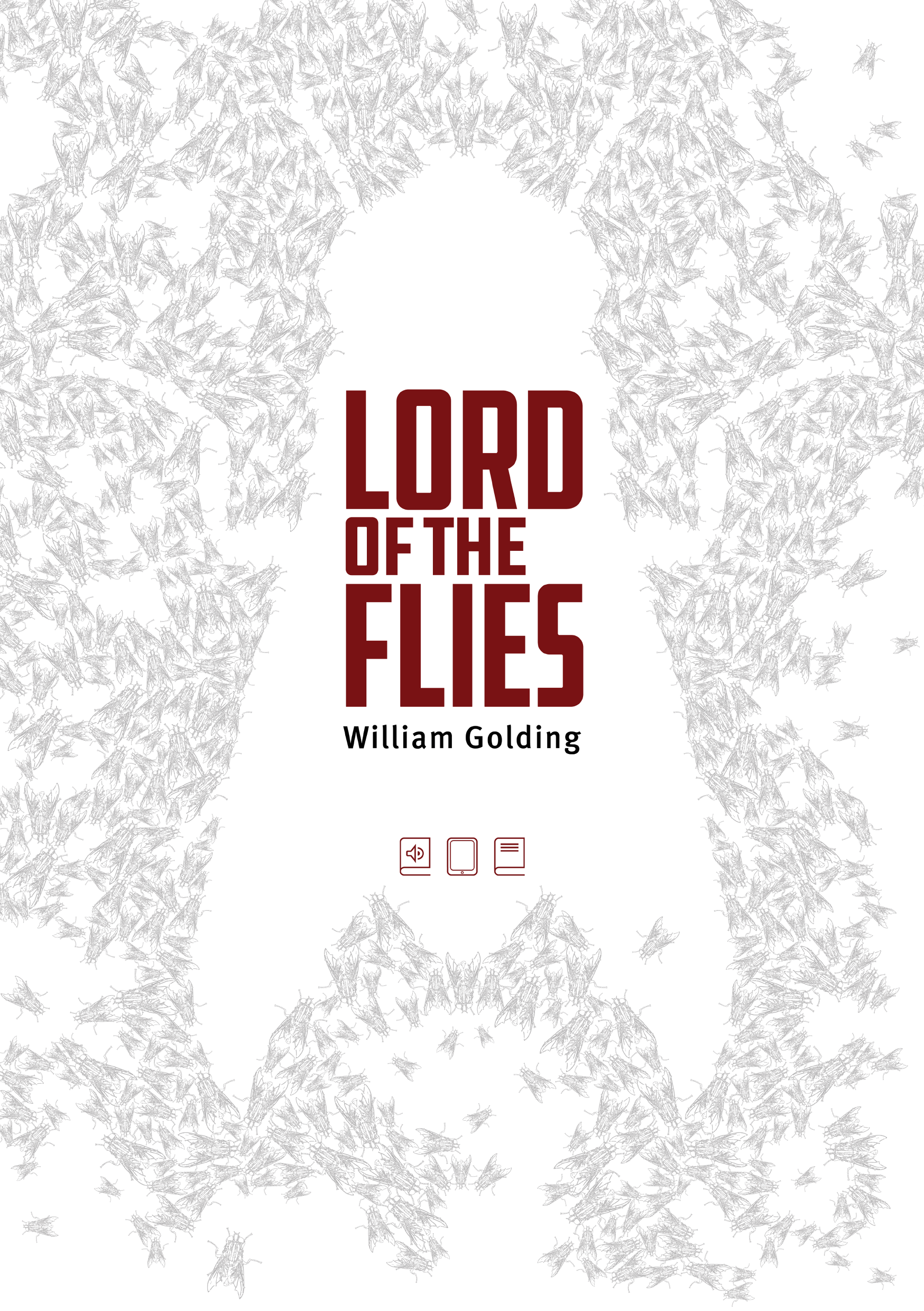 Lord of the Flies is built around a strong central axis supported by a modular field that accommodates both dense imagery and structured typography. On the front cover, the composition is centered vertically, with the title block positioned as the primary organizing element inside a large open area carved from the surrounding swarm imagery. The insect pattern operates within the grid as a framing device, while the typography remains locked to a stable central structure that preserves legibility against the highly active background. This creates a clear relationship between image density and negative space.