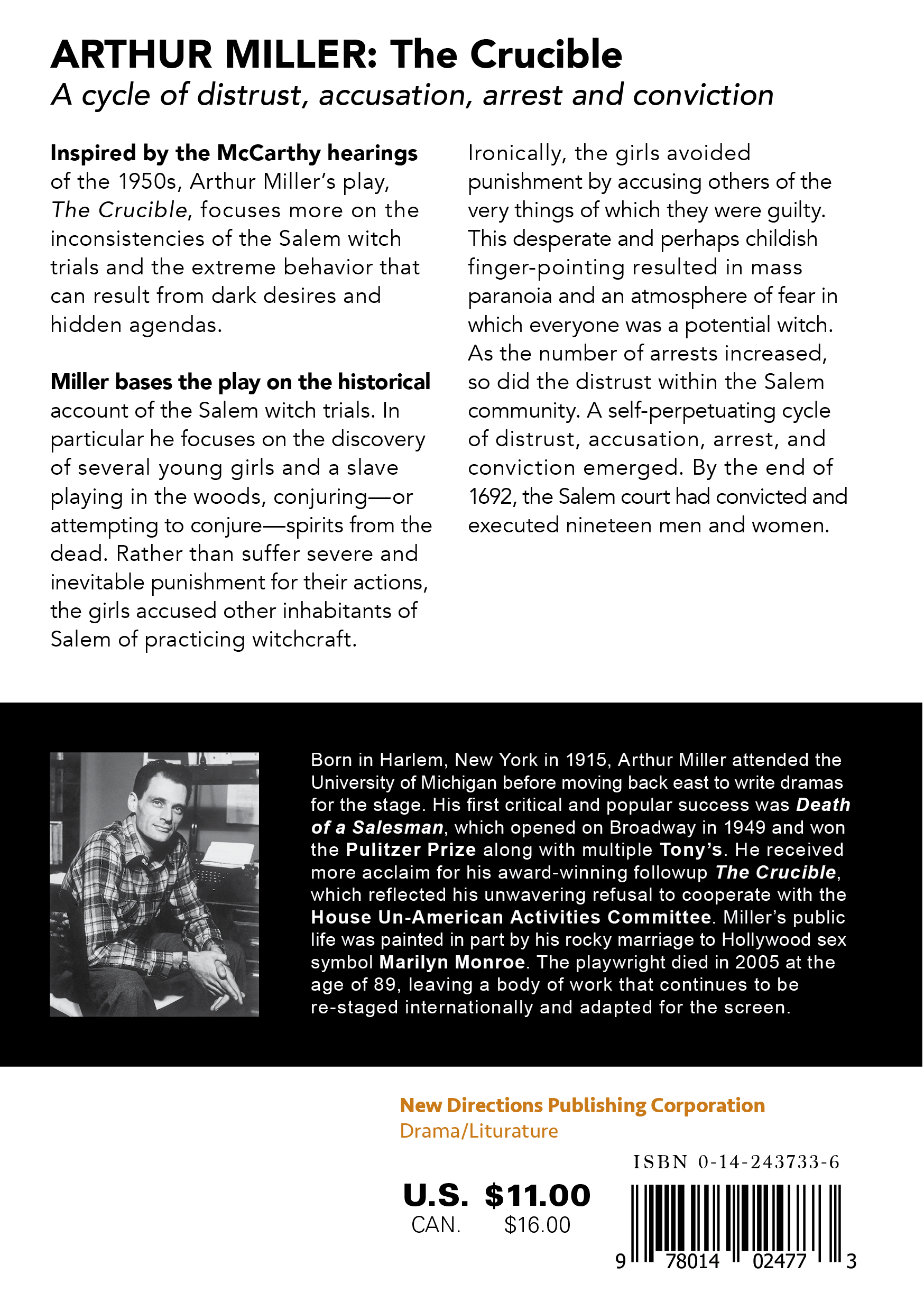 The Crucible is structured to support strong vertical movement and a clear division between expressive content and informational content. On the front cover, the composition uses a centralized alignment system that anchors the title within a narrow upper field, while the surrounding vertical texture reinforces the grid’s directional emphasis. The author’s name is positioned in a broad lower band, creating a stable base that counterbalances the more active upper portion of the cover. This arrangement allows the composition to feel tense and atmospheric while remaining highly controlled.