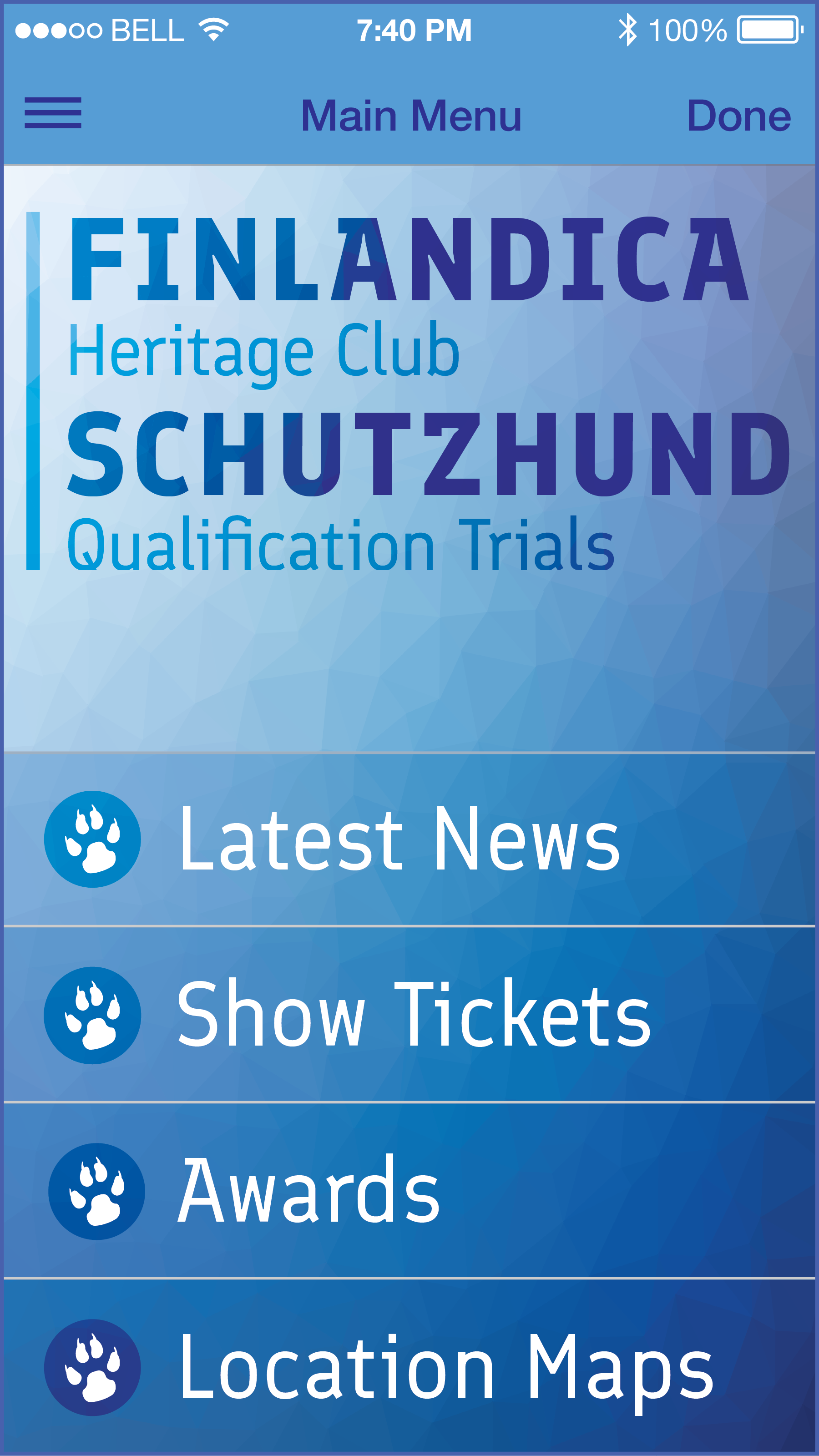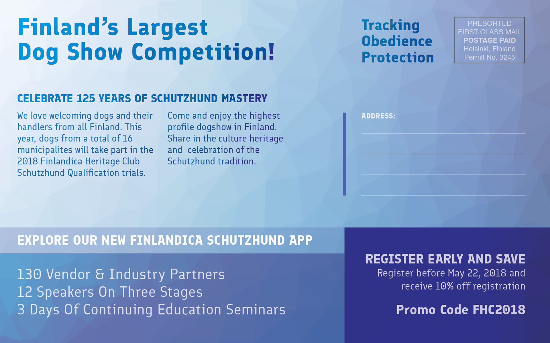 This promotional campaign was created for the Finlandica Heritage Club Schutzhund Qualification Trials, a multi-day working-dog competition held in Helsinki, Finland. The project includes a coordinated set of promotional materials consisting of a large-format event poster, a direct-mail postcard, and a conceptual mobile event app interface designed to extend the event identity across both print and digital platforms.