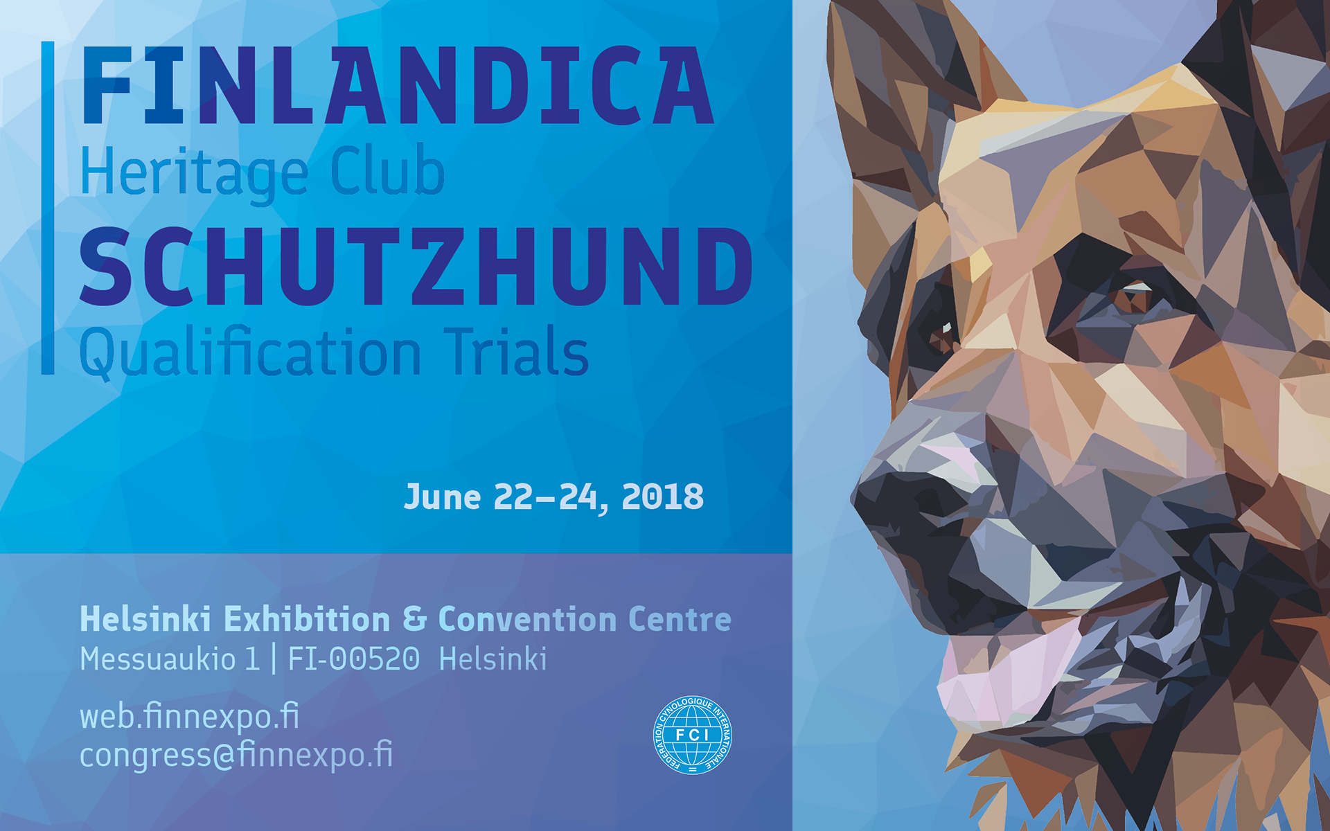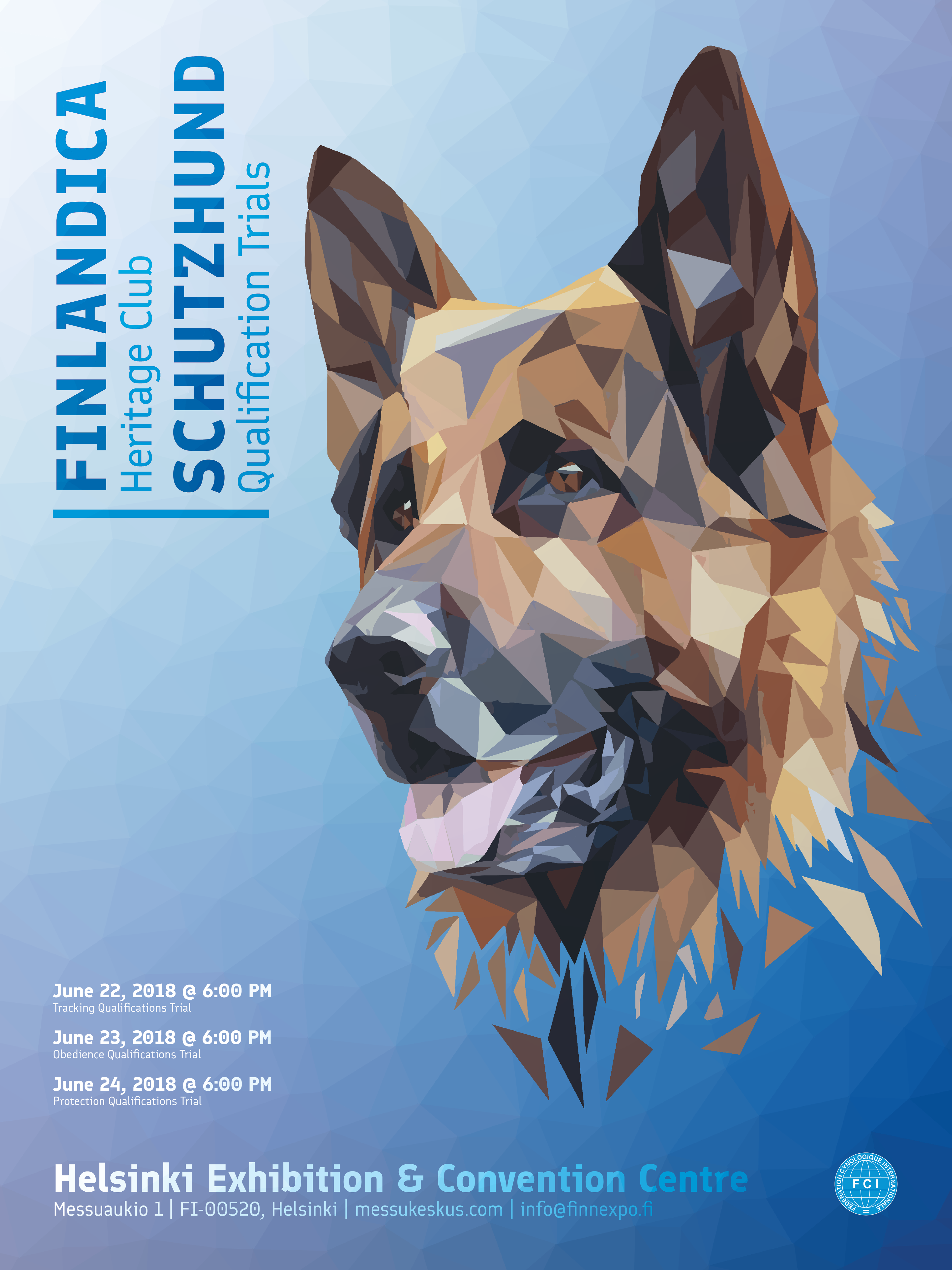 Large-format poster promoting the Finlandica Heritage Club Schutzhund Qualification Trials, combining a faceted German Shepherd illustration with a structured typographic hierarchy to communicate event details clearly at distance.