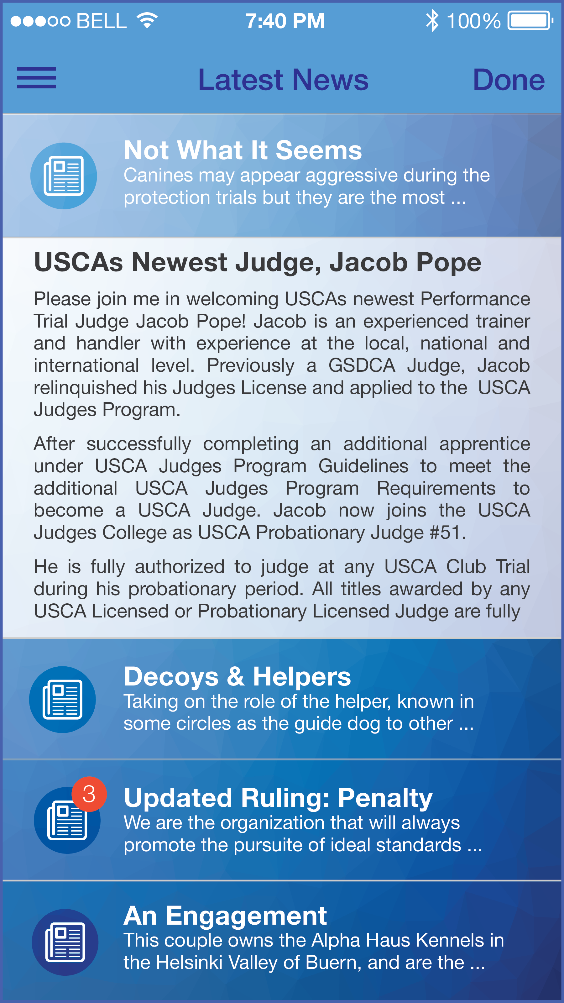 Conceptual mobile app screens extending the Finlandica Schutzhund Qualification Trials identity into a digital event interface. The set applies the campaign’s geometric illustration, blue palette, and typographic hierarchy across navigation, ticketing, and news features for a consistent cross-platform experience.
