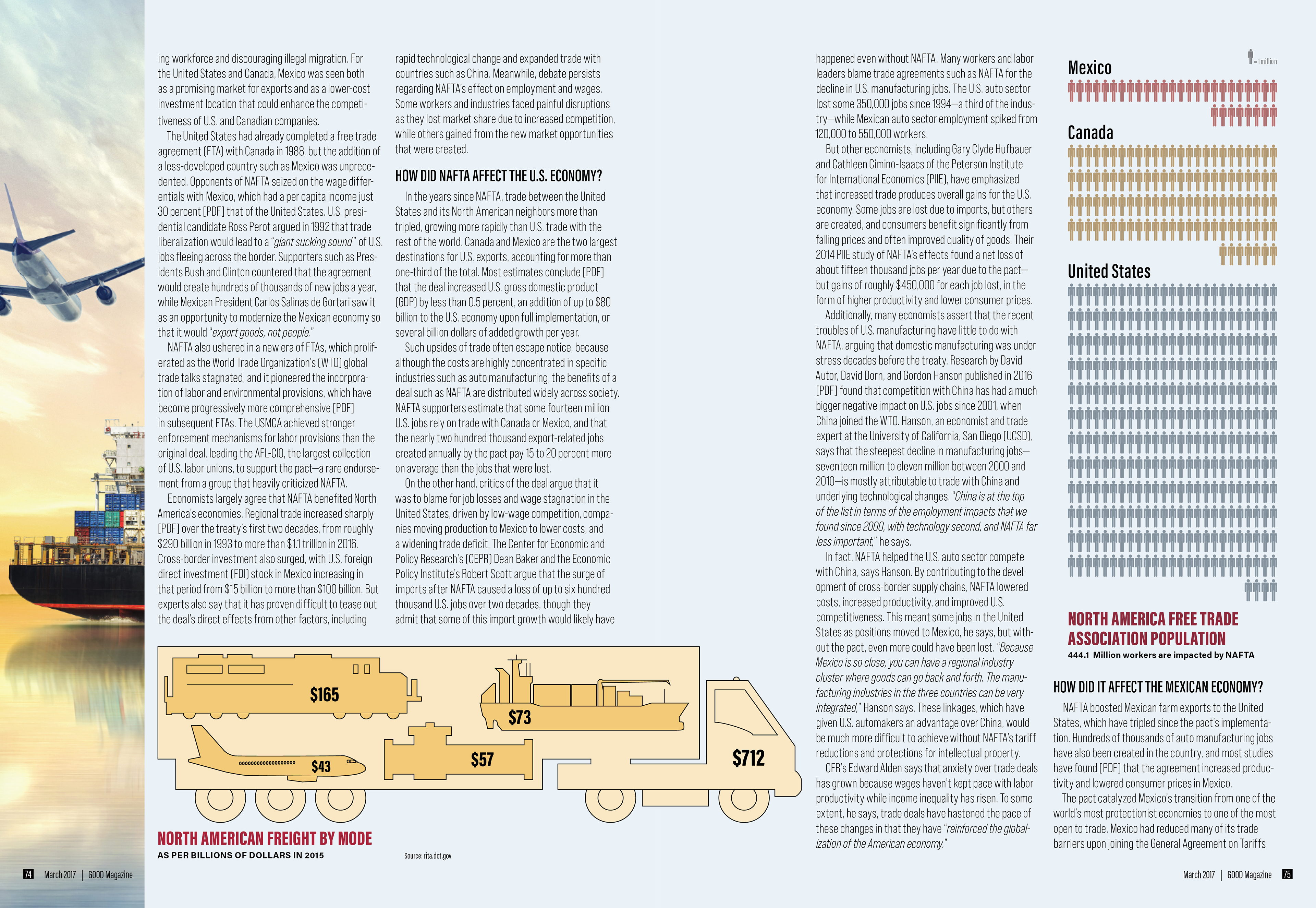 Interior spread with freight infographic: Multi-column editorial layout that organizes dense text alongside a horizontal information graphic. The spread uses consistent column structure, measured spacing, and a large bottom-aligned diagram to vary pacing while maintaining continuity across the article.
