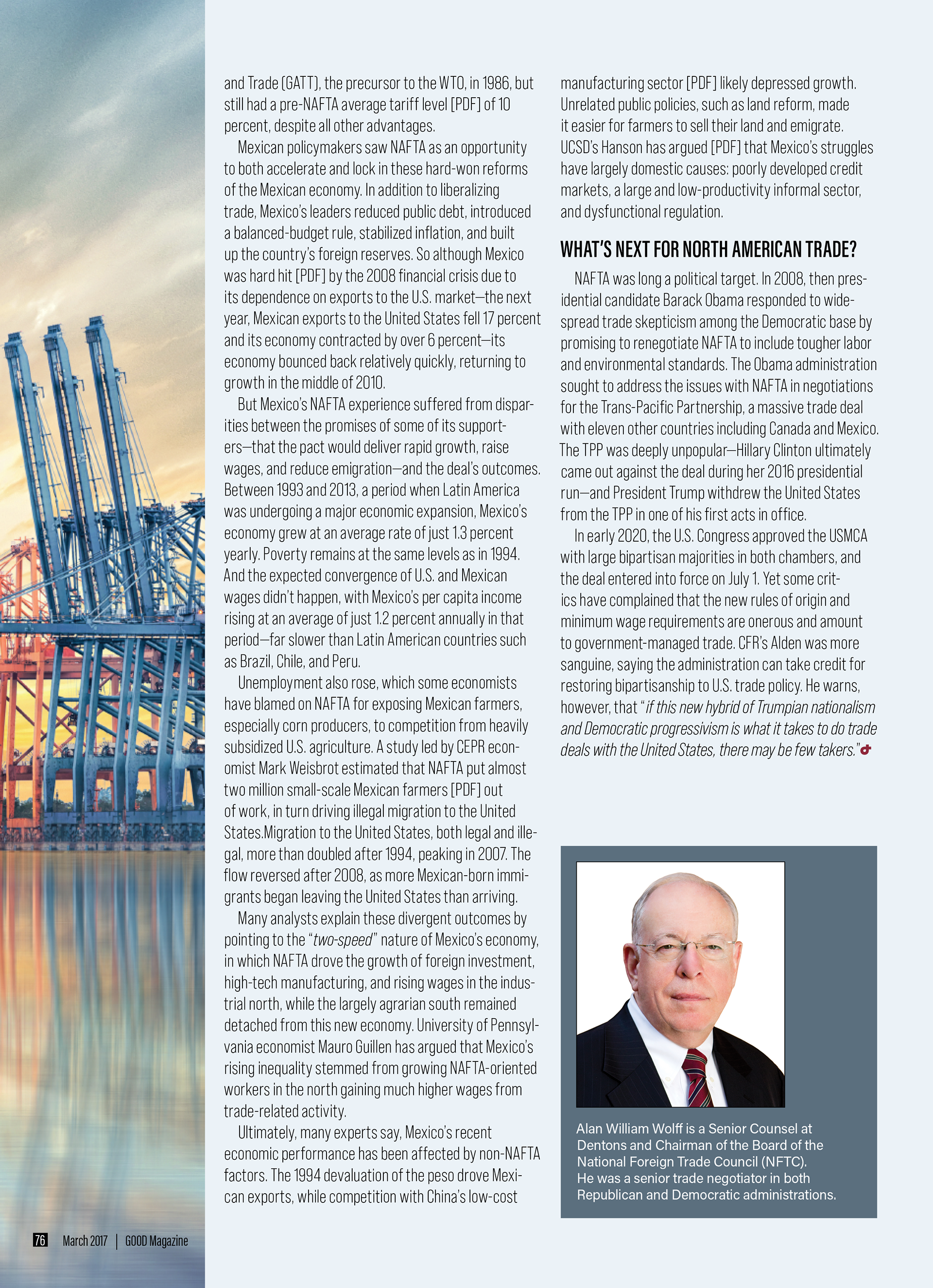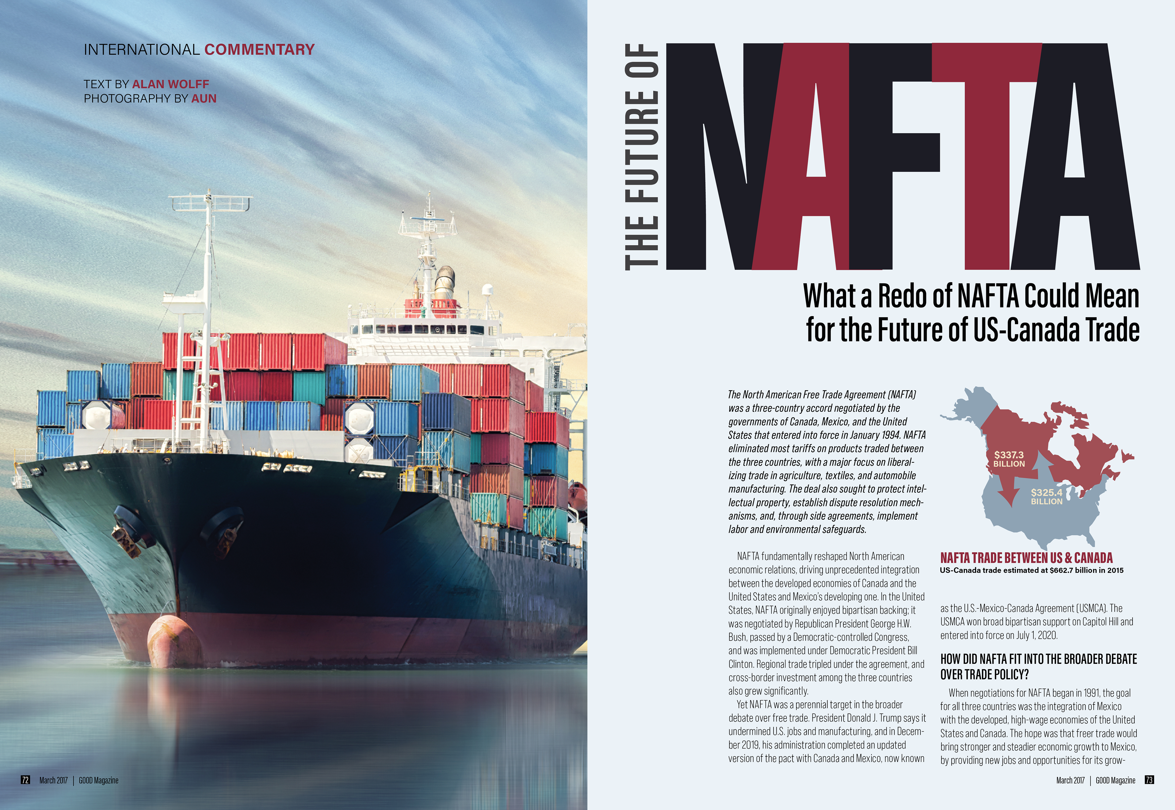 This editorial feature was designed to present a policy-driven topic through a publication format that balances readability, visual impact, and structured information delivery. The project translates a complex subject—North American trade relations—into a multi-page magazine article organized through strong typographic hierarchy, image-led pacing, and strategically placed infographics. Rather than treating the article as a purely textual document, the design frames it as a sequence of distinct reading experiences, moving from a dramatic opener to denser analytical spreads and concluding with a more contained author bio and closing text.