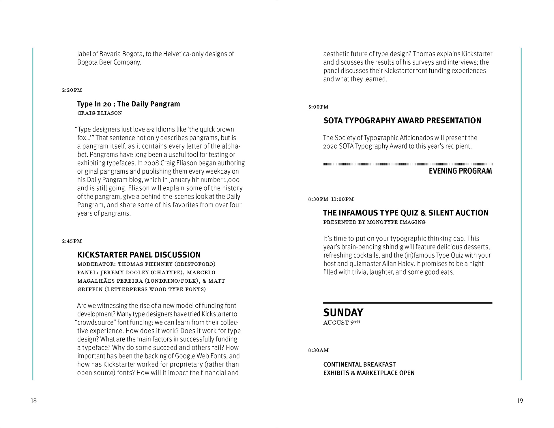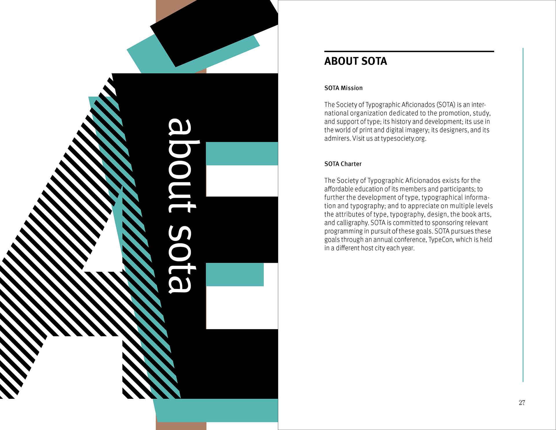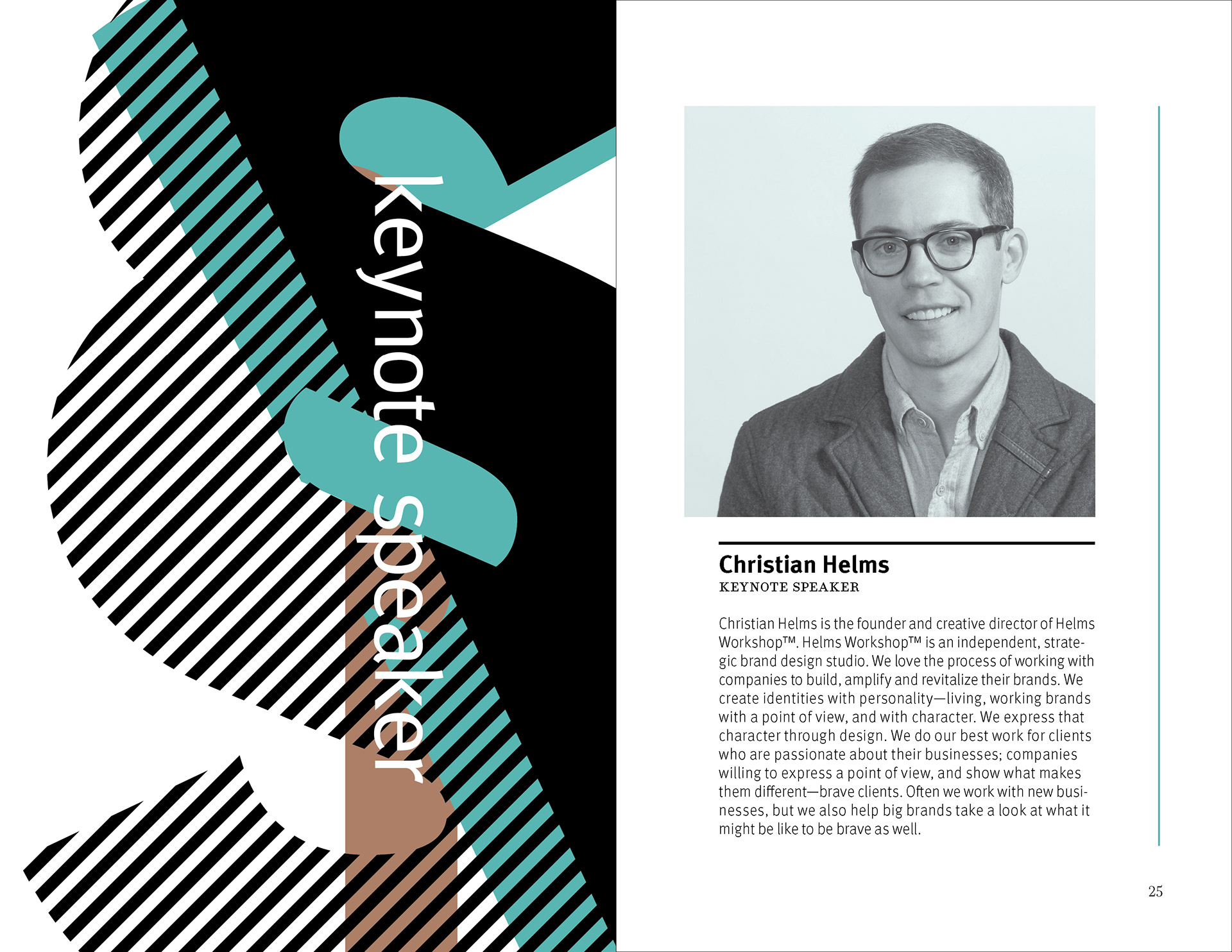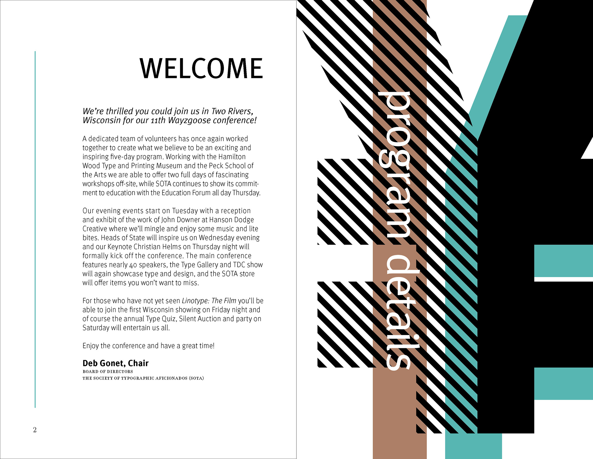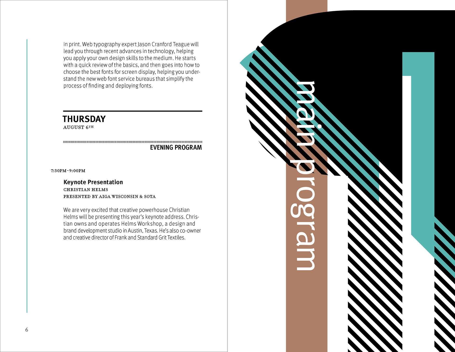 The design strategy relies on a clear contrast between expressive divider pages and highly structured information spreads. Large cropped letterforms, diagonal striping, and a restrained palette of black, white, aqua, and muted brown establish a recognizable visual language that moves throughout the brochure. In the content-heavy spreads, that language is moderated through disciplined margins, stable column structures, and carefully managed hierarchy so that schedules and descriptions remain readable. This interplay between energetic formal composition and controlled editorial organization allows the brochure to function as both a communication tool and a designed reading experience.