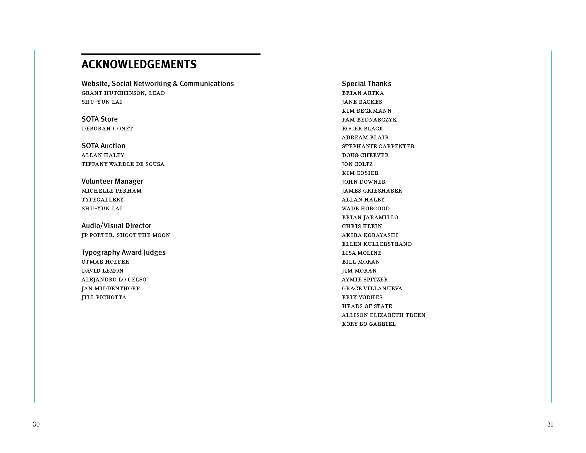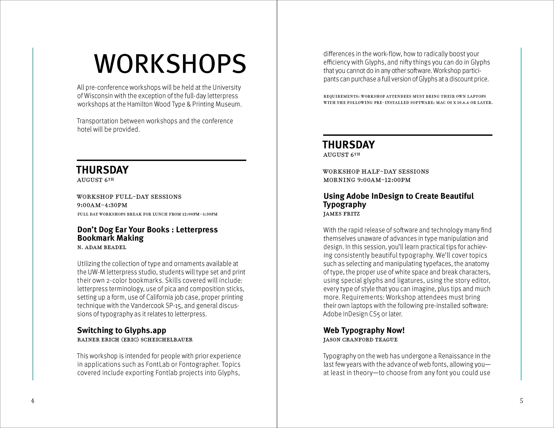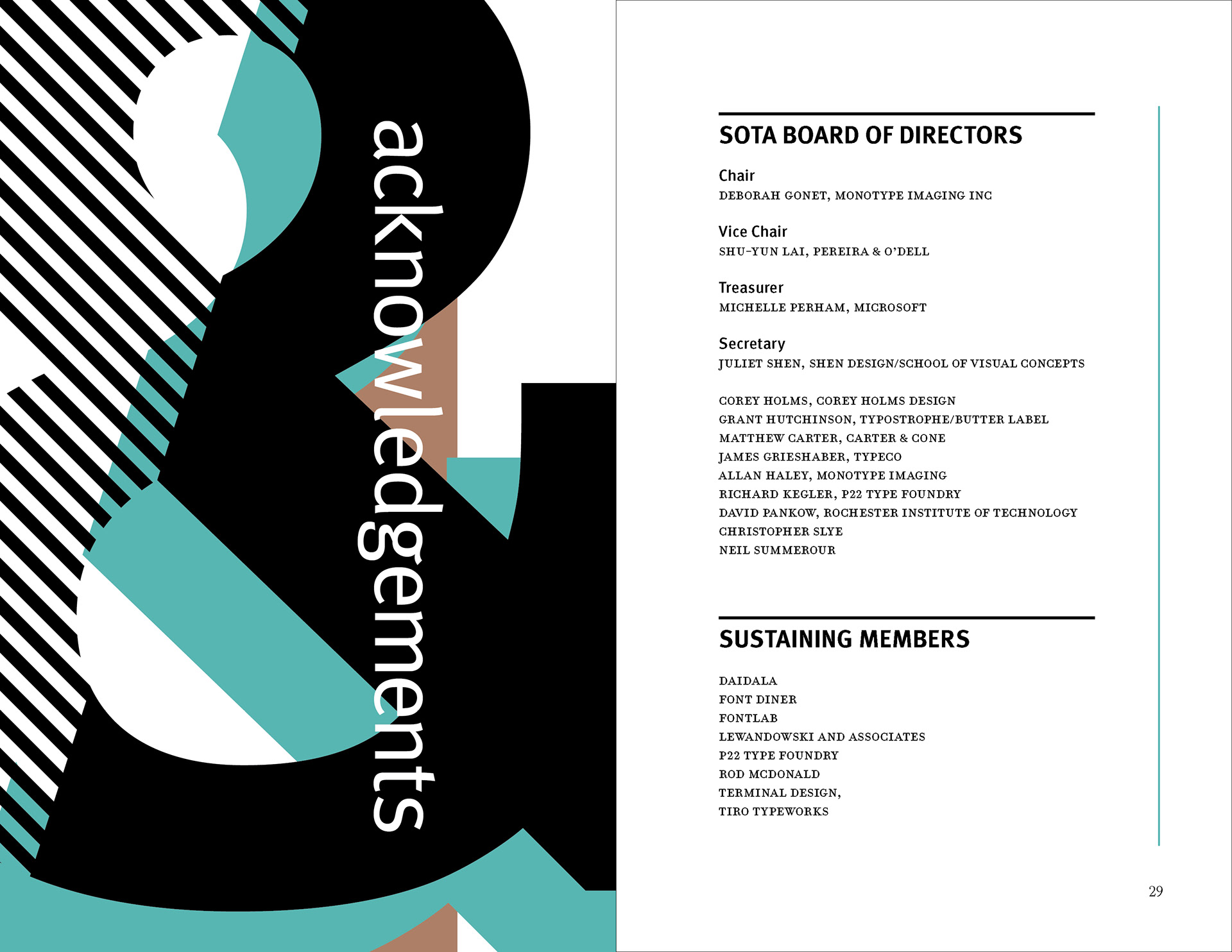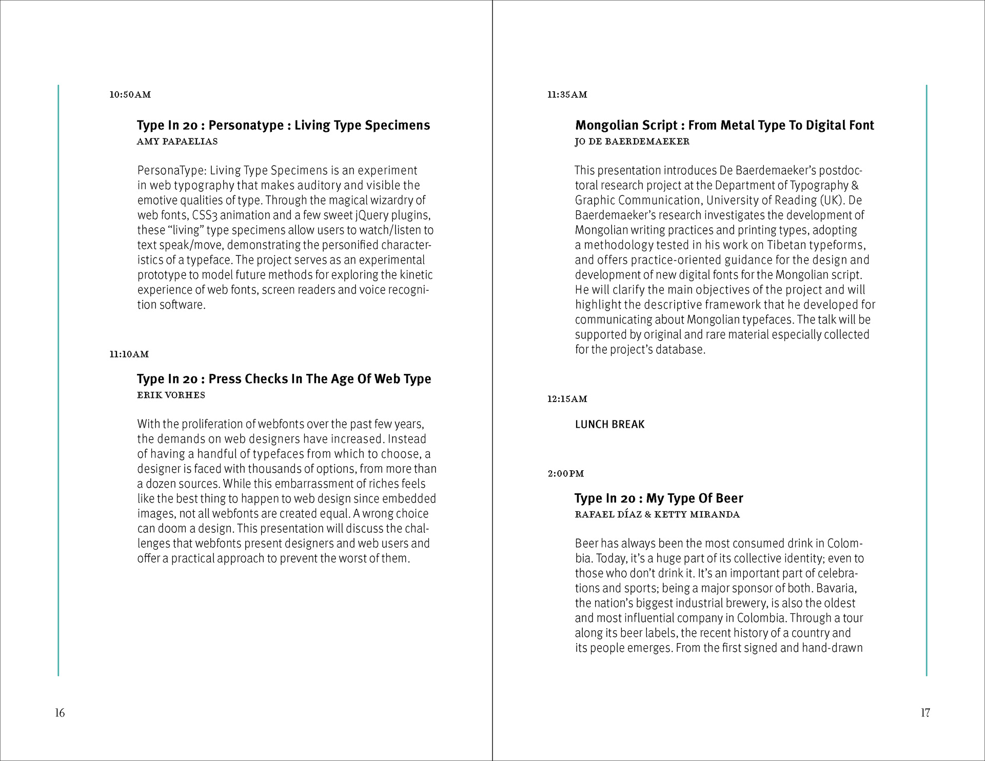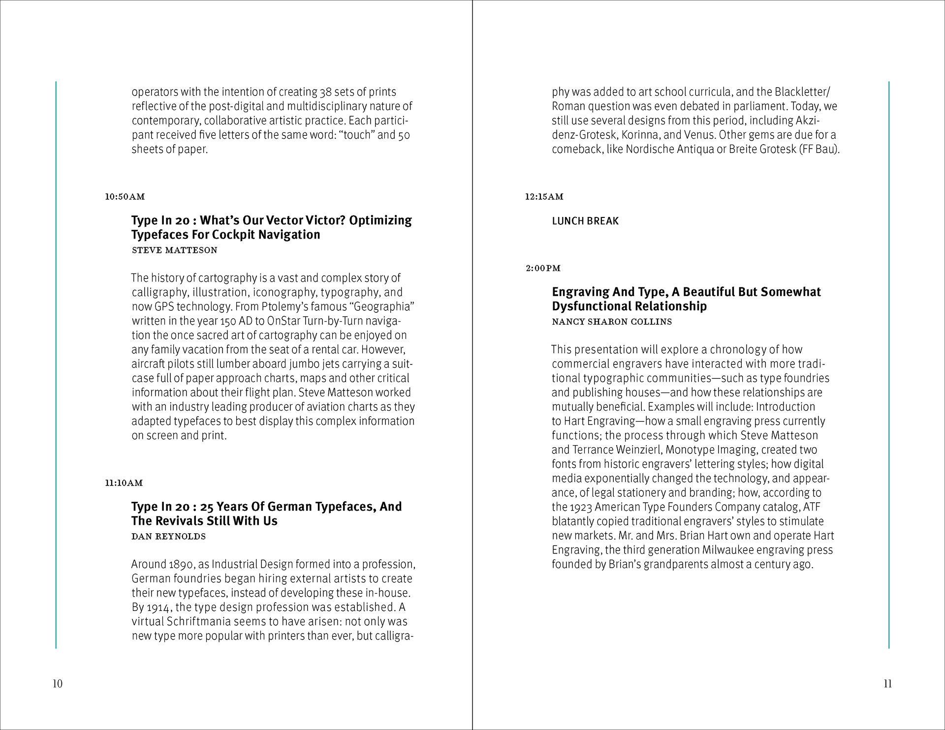 The design strategy relies on a clear contrast between expressive divider pages and highly structured information spreads. Large cropped letterforms, diagonal striping, and a restrained palette of black, white, aqua, and muted brown establish a recognizable visual language that moves throughout the brochure. In the content-heavy spreads, that language is moderated through disciplined margins, stable column structures, and carefully managed hierarchy so that schedules and descriptions remain readable. This interplay between energetic formal composition and controlled editorial organization allows the brochure to function as both a communication tool and a designed reading experience.