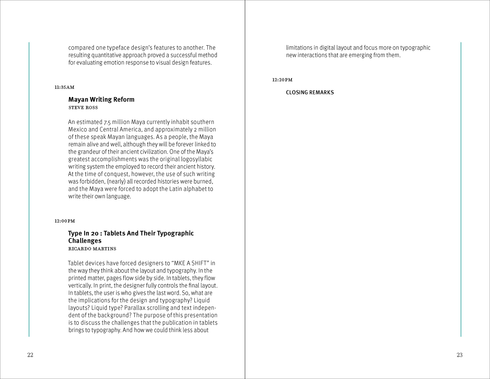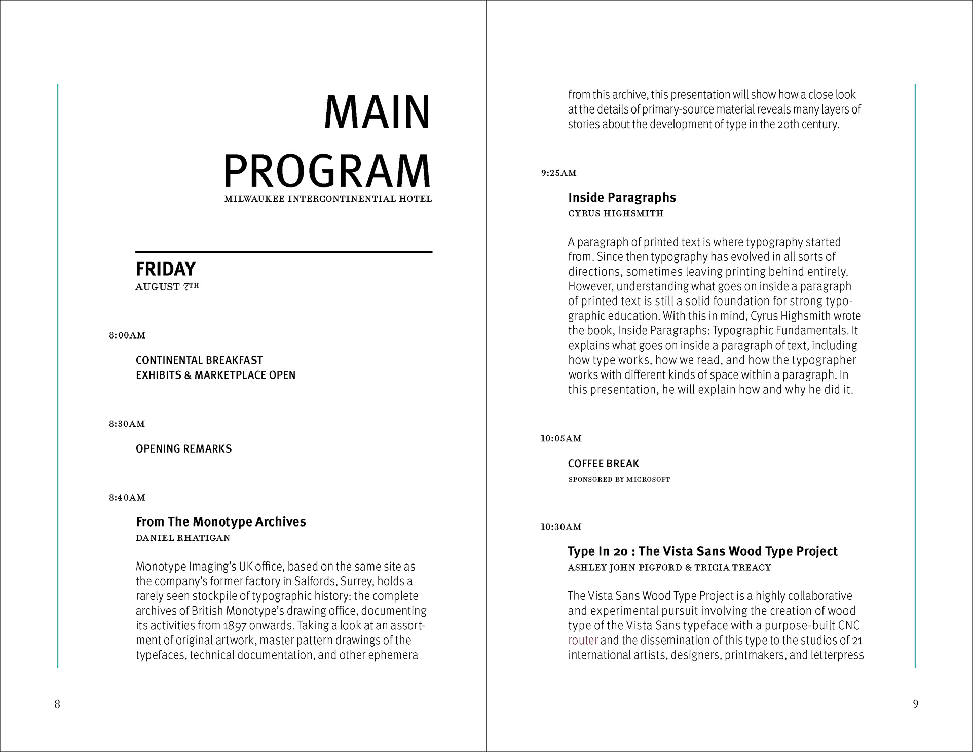 This project develops a conference brochure for a Wayzgoose event as an editorial system that balances functional program information with a strong typographic identity. The publication is tasked with organizing a large volume of schedules, speaker information, venue content, acknowledgements, and reference material while maintaining visual coherence across the full brochure. Rather than treating the piece as a neutral informational handout, the design positions the brochure as an extension of the event itself, using typography, pacing, and formal repetition to create a publication that is both navigable and visually distinctive.