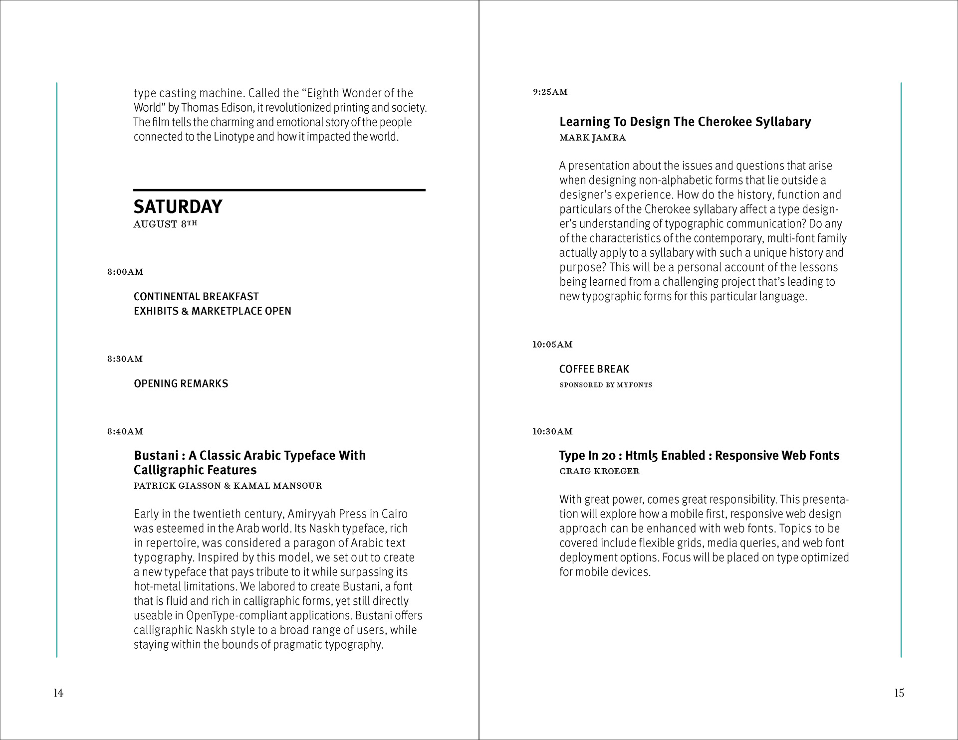 The brochure was developed as a unified editorial system organized through a modular grid, consistent typographic hierarchy, and repeated sectional pacing. Large typographic forms and graphic patterning were used as navigational and identity elements, while schedule and informational pages were structured through disciplined column alignment, spacing logic, and production-aware layout decisions appropriate to a multi-page conference publication.